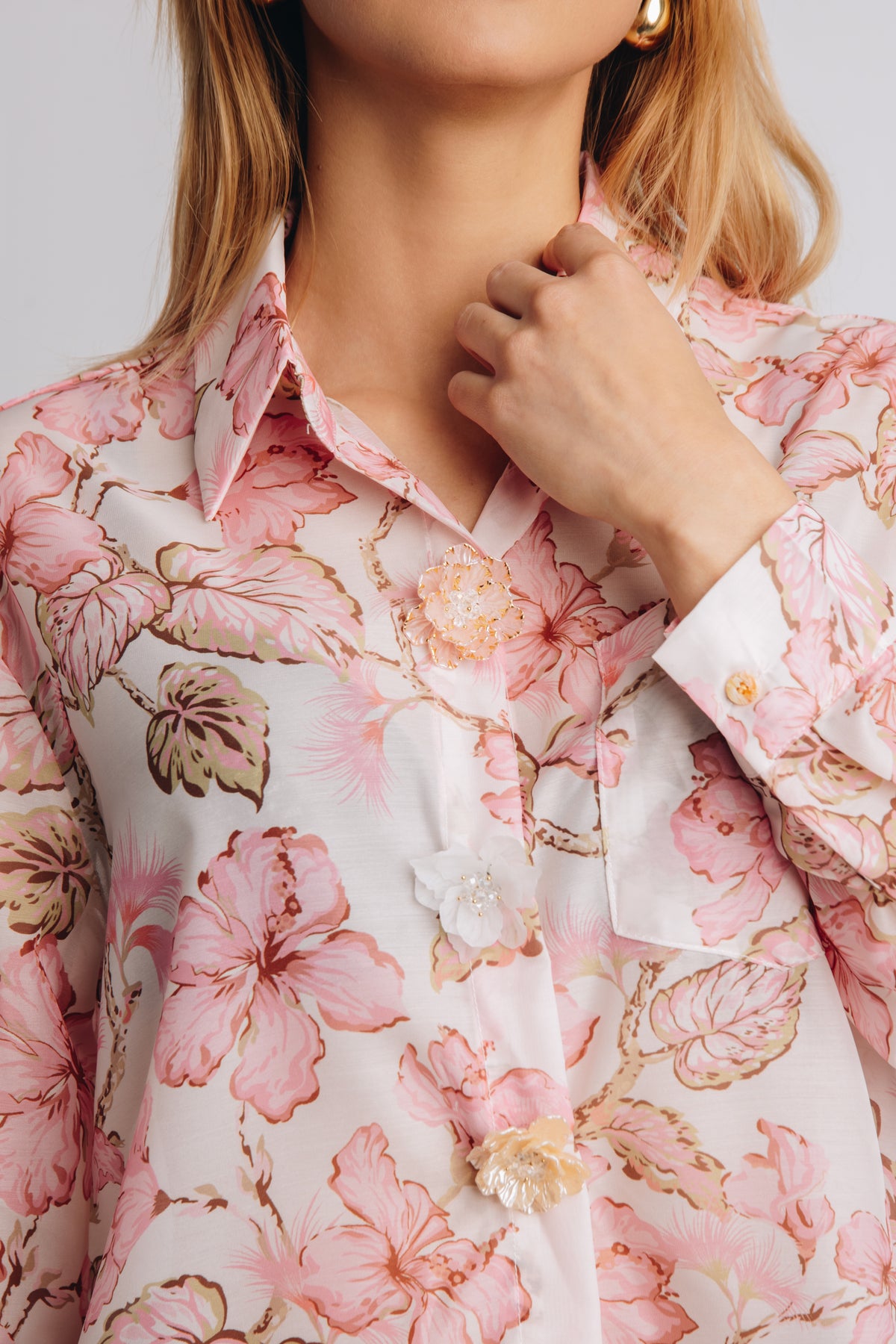 De opvallende knoopjes met 3D-bloemen . Ze fungeren bijna als subtiele sieraden op zich. Bij deze blouse heb je nauwelijks accessoires nodig – de blouse zelf doet al het werk voor je.